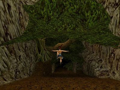 Trèo lên tảng đá và theo hành lang trở về cái hang có con thác. Lấy đà nhảy về phía thác lấy đạn rồi hạ xuống bãi đất leo lên gờ đá bên trái. Nhảy bám lên sợi dây treo là leo lên giữa sợi dây (cho tới khi bạn nghe tiếng bọn dơi). Xoay sang trái và nhảy xuống chỗ bức tường lấy đạn trên bãi đất bên trái. Đu dây trở lại qua dòng nước và nhảy qua mấy góc quanh tìm một sườn dốc. Nhảy tới gờ đá rồi nhảy bám tới chỗ bức tường và leo lên. Khi bạn ra ngoài, tìm bên phải thấy một đường hầm thì bạn hãy vào đó. Tránh mấy cái bẫy đá ở đây và khi bạn vào căn phòng có lối đi nhỏ bạn hãy đi chậm một khoảng ngắn rồi chạy lại lối đi nhỏ. Đu mình và leo lên chỗ ngõ cụt đối diện để tránh ngọn lửa và cái bẫy đá. Trở lại chỗ dòng sông bạn có thể nhẩy sang phải tới chỗ cái khe nhỏ. Sau khi qua cái khe chật hẹp này bạn có thể đứng lên, tìm tới chỗ một dây cáp trượt trượt tới một gờ đá thấp.