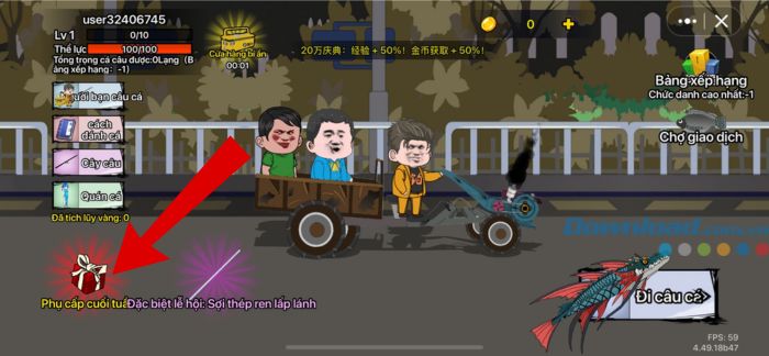 Bước 1: Mở Câu Cá Vạn Cân trên thiết bị và nhấn vào biểu tượng hộp quà màu đỏ ở góc dưới cùng bên trái giao diện chính.