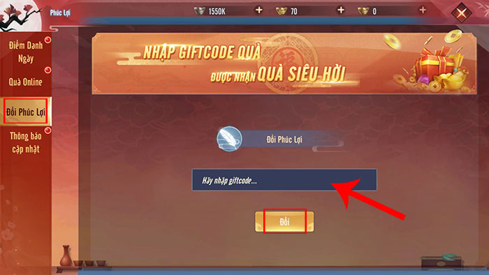 Bước 2: Nhấn vào tab Đổi Phúc lợi. Sau đó, nhập chính xác hoặc sao chép mã code được cung cấp phía trên vào ô trống. Cuối cùng, nhấn nút Đổi để xác nhận dùng code và nhận thưởng ngay lập tức.