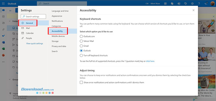 Tiếp theo, chọn Settings (biểu tượng bánh răng) > View all Outlook settings > General > Accesbility.