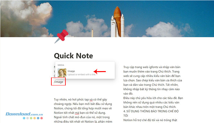 Người dùng có thể thêm các loại tệp phương tiện khác nhau trong một ghi chú trong Notion. Nhập /image để thêm hình ảnh, /pdf để thêm pdf, /video để tích hợp bất kỳ video nào,... Notion cũng hỗ trợ các tệp âm thanh và tài liệu, mọi người chỉ nhập loại phương tiện truyền thông tương ứng mà mình muốn thêm vào ghi chú.