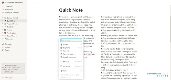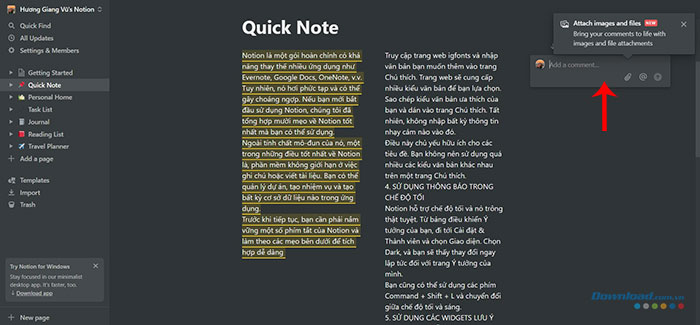 Một trong những điểm mạnh cốt lõi của Notion là cộng tác giữa các thành viên trong không gian làm việc. Việc theo dõi các thay đổi và đề xuất của các thành viên trong nhóm diễn ra liền mạch trong ứng dụng. Với phím tắt Ctrl + Shift + M hoặc Command + Shift + M, bạngười dùngn có thể nhanh chóng tạo nhận xét ở cuối khối.