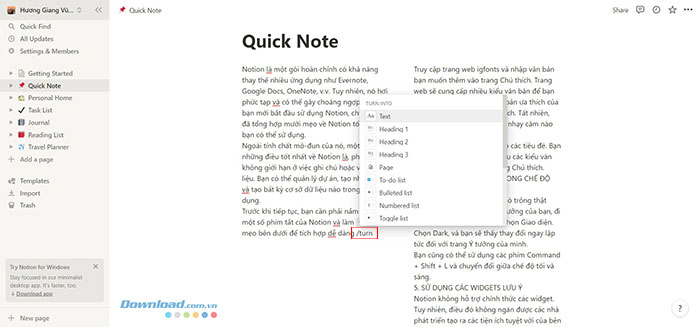 Trong khi Notion chỉ yêu cầu một lệnh ngắn ở đầu hoặc cuối khối. Nhập /turn và người dùng sẽ được cung cấp các tùy chọn khác nhau như Dòng tiêu đề 1 (Headline 1), việc cần làm (to-do), trang (page),...