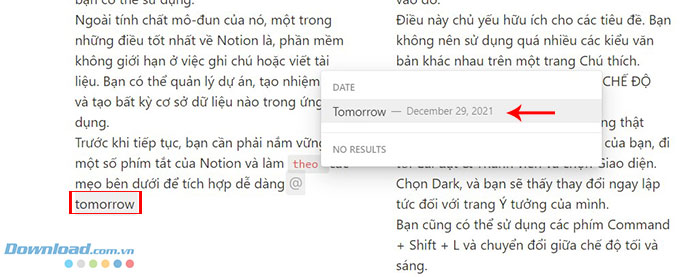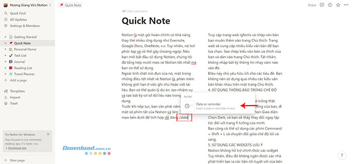 Notion cho phép thêm ngày vào cuối khối để theo dõi dòng thời gian của ghi chú bằng cách nhập /date.