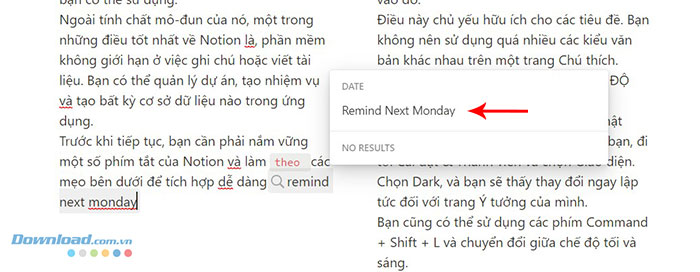 Notion cũng hoạt động như một ứng dụng quản lý tác vụ. Điều đó có nghĩa là nó cho phép thêm các tác vụ và chức năng nhắc nhở. Nhập /reminder vào cuối khối và thêm ngày. Bây giờ, Notion sẽ tạo ra một liên kết, nhấp vào và thêm thời gian cho nó. Notion sẽ thông báo cho người dùng về khối đó vào thời điểm đã đặt.