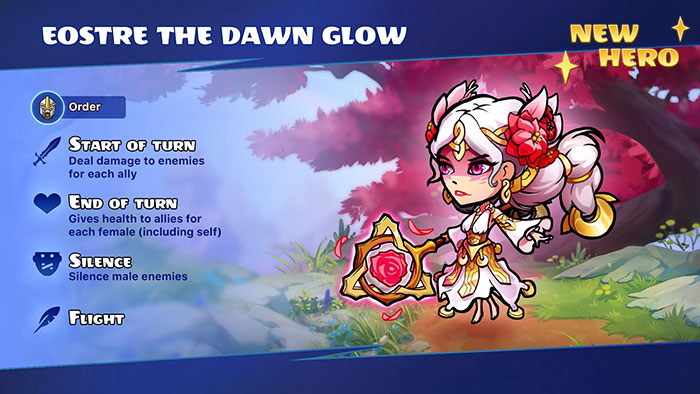 Eostre the Dawn Glow là một đơn vị tầm xa, tiến hóa từ Sunrise Maiden. Với 10 ATK và 25 HP, mạnh mẽ ngay cả ở cấp độ 1, cô ấy có thể khiến kẻ thù bị câm lặng, tăng +4 HP cho đồng minh nữ vào cuối lượt và gây 3 DMG. Eostre cũng có khả năng bay, khiến cô ấy thậm chí còn ngầu hơn.