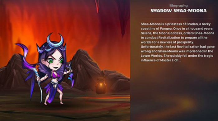 Cô ấy là một anh hùng thuộc loại cận chiến, tiến hóa từ Half Moon Priestess. Bên cạnh việc có 14 ATK và 12 HP ở cấp độ cơ bản, Shaa-Moona có thể triệu hồi Eclipse Shard ở hàng đầu tiên, gây 6 DMG cho kẻ thù xung quanh (bán kính 2) và có kỹ năng phản đòn.