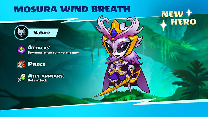 Mosura tiến hóa từ Imago dưới dạng Melee và đi kèm với 8 ATK cùng 9 HP ở cấp độ cơ bản. Các kỹ năng khiến cô ấy trở thành một anh hùng tuyệt vời, bao gồm khả năng triệu tập một bản sao của chính cô ấy vào đội hình, thêm 5 sát thương xuyên thấu và nhận +2 ATK khi một đồng minh xuất hiện.