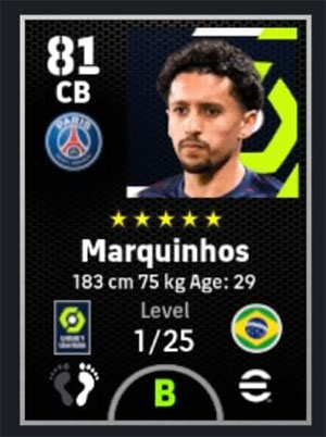 Không quá cao nhưng lại là một con quái vật tuyệt đối trên sân, Marquinhos nổi bật như một thế lực thực sự đáng được coi trọng. Anh ấy là một sự lựa chọn tuyệt vời cho những người chơi đánh giá cao lối chơi Build Up, được hỗ trợ bởi khả năng đặc biệt trong việc xây dựng lối chơi và cung cấp khả năng phòng thủ vững chắc. Với hai kỹ năng chuyền bóng ấn tượng, Marquinhos có thể bổ sung hoàn hảo cho nhiều lối chơi khác nhau.