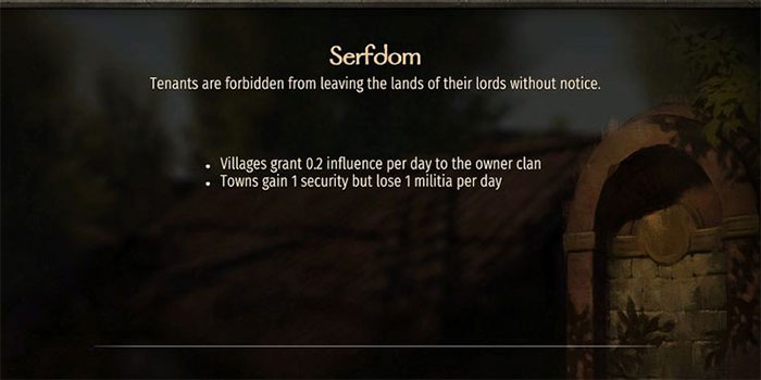 Serfdom là một trong số ít các chính sách gần như không có tác động tiêu cực đến vương quốc. Những hiệu ứng đầu tiên sẽ tăng thêm một lượng ảnh hưởng nhỏ cho mỗi ngôi làng mà game thủ có và xét rằng mỗi khu định cư có 2-3 ngôi làng bị ràng buộc, điều này có thể cộng lại thành một khoản kha khá cho các gia tộc lớn hơn trong vương quốc.