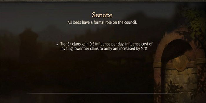 Chính sách của Senate rất đơn giản nhưng hiệu quả, đặc biệt nếu game thủ đang gặp khó khăn trong việc giành được sức ảnh hưởng. Chính sách này mang lại cho các gia tộc cấp +3 một lượng nhỏ ảnh hưởng hàng ngày, nhưng đổi lại, việc kêu gọi các đảng cấp thấp hơn vào quân đội của mình sẽ tốn nhiều ảnh hưởng hơn.