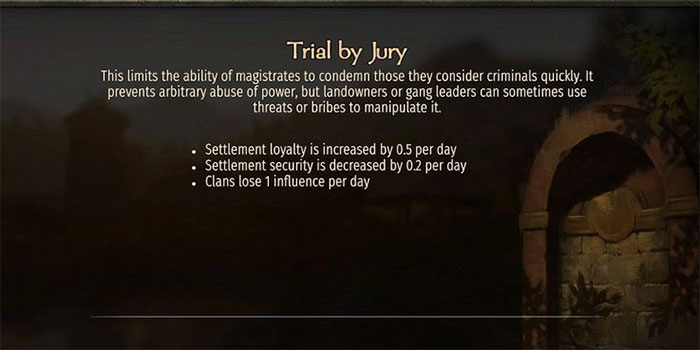 Những chính sách này cũng có nhược điểm, đối với Trial by Jury là tính bảo mật bị giảm nhẹ. Tuy nhiên, an ninh có thể dễ dàng được tăng cường bằng cách gửi quân đến đồn trú và thực hiện các nhiệm vụ cho thị trấn cũng như các làng liên kết của nó.