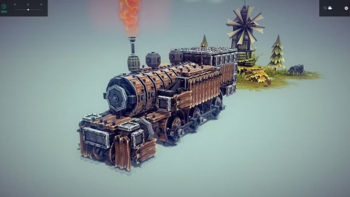 Điều ấn tượng nhất là người tạo ra nó đã cực kỳ chú ý đến tính chân thực của đầu máy hơi nước. Thay vì dùng bánh xe mặc định của game, họ đã thiết kế hẳn một hệ thống piston hoàn chỉnh cùng bánh xe thủ công, cho phép cỗ máy di chuyển tiến lùi như đầu máy thật. Chỉ thiếu vài quả bom gắn thêm nữa là đủ “chuẩn Besiege”.