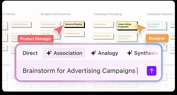Ayoa là công cụ tiên phong trong cách mạng hóa việc brainstorm kỹ thuật số với công nghệ AI. Nền tảng sáng tạo này mang đến cách tiếp cận mới mẻ cho tư duy trực quan và quản lý dự án bằng cách tích hợp AI vào quá trình tạo sơ đồ tư duy.