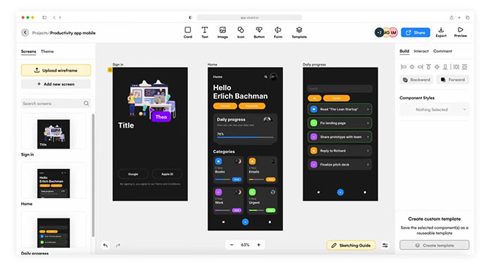 Uizard có tính năng cộng tác thời gian thực giúp nhiều thành viên trong nhóm có thể cùng làm việc trên cùng một thiết kế và dễ dàng chia sẻ với khách hàng hoặc các bên liên quan.
