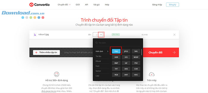Để chuyển đổi tệp nhanh chóng từ máy tính, Dropbox, Google Drive hoặc URL thì Convertio là lựa chọn tuyệt vời. Người dùng chỉ cần lựa chọn tệp của mình và sau đó chọn loại tệp như Hình ảnh, Video,... và nhấn vào định dạng file đích.