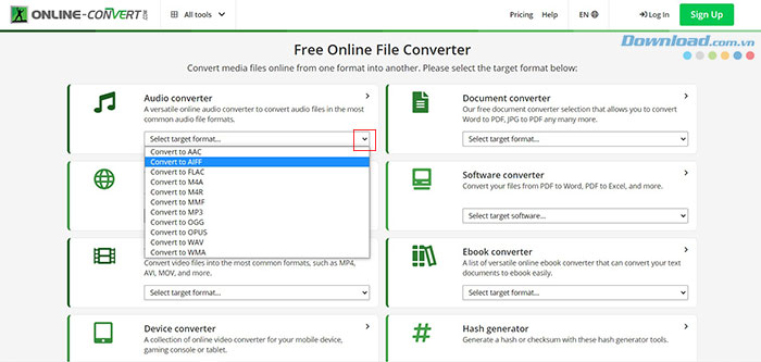 Trước khi thử chuyển đổi tệp trên Online-Convert.com, người dùng có thể nhanh chóng kiểm tra các loại tệp được hỗ trợ. Trong hộp nhỏ ở dưới mỗi danh mục chuyển đổi như âm thanh, video hình ảnh,... và lựa chọn định dạng tệp mong muốn.
