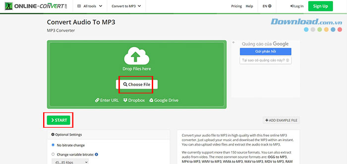 Người dùng sẽ đến một trang mới, nơi có thể duyệt tìm tệp của mình, nhập URL của tệp hoặc tải lên từ dịch vụ lưu trữ đám mây. Cuối cùng, nhấp vào Start để bắt đầu quá trình chuyển đổi.