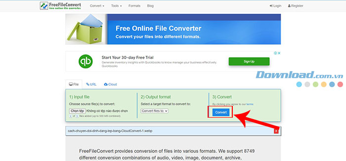 FreeFileConvert hỗ trợ tới 8700 kết hợp chuyển đổi, có thể thêm tối đa 5 file để chuyển đổi cùng một lúc, chỉ cần lưu ý rằng chúng phải cùng một loại tệp. Sau khi tải tệp lên, hộp định dạng đầu ra sẽ tự động điều chỉnh với các định dạng được đề xuất. Nhấp vào Convert khi nó đã sẵn sàng và sau đó nhận tệp mới bằng cách nhấp vào Download.