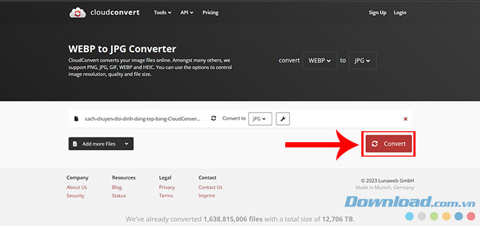 Cuối cùng, nhấn vào nút Chuyển đổi và đợi xem tiến trình chuyển đổi cùng với kích thước tệp. Sau đó, nhấn vào nút Tải xuống cho mỗi tệp tương ứng. Convertio cũng cho phép tải xuống tệp ZIP chứa tất cả các file chuyển đổi một cách nhanh chóng.