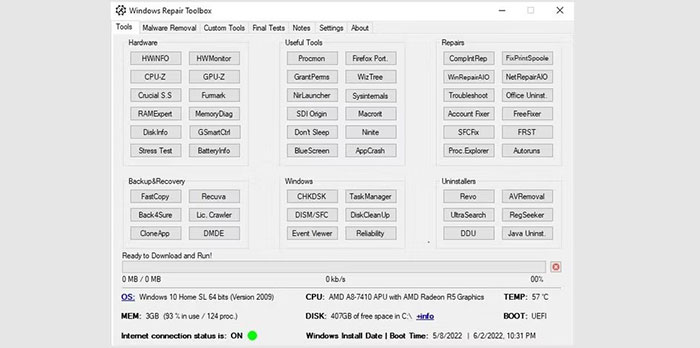 Với Windows Repair Toolbox, người dùng sẽ nhận được một gói hoàn chỉnh gồm khá nhiều công cụ sửa chữa quan trọng, cần thiết cho PC. Khi mở ứng dụng, mọi người sẽ thấy một loạt các công cụ khác trên màn hình chính, được sắp xếp thành các phần riêng biệt như Hardware, Repairs, Uninstaller,...