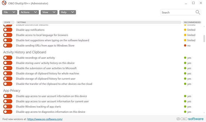 O&O ShutUp thậm chí không yêu cầu cài đặt, mọi người chỉ cần tải xuống tệp EXE, khởi chạy và sẵn sàng tận dụng tất cả tính năng của nó. Sau khi chạy, ngay lập tức người dùng sẽ được hiển thị một danh sách dài các tính năng Windows mà công cụ này có thể chặn.
