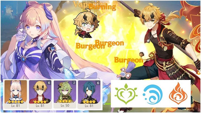 Burgeon là phản ứng tốt nhất cho sát thương AoE nên không cần sử dụng Venti và Kazuha để thu thập kẻ thù. Thay vào đó, người chơi nên sử dụng Sucrose để buff EM cho Thoma. Nếu không có Thoma trong đội này, hãy sử dụng Xiangling hoặc Dehya làm các lựa chọn thay thế. Nahida và Kokomi chịu trách nhiệm tạo lõi Dendro.
