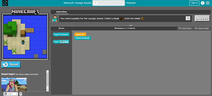 Minecraft đã trở lại với một hoạt động hoàn toàn mới! Sử dụng khả năng sáng tạo và kỹ năng giải quyết vấn đề để khám phá và xây dựng thế giới dưới nước bằng code. Xây dựng và khám phá cùng Minecraft Voyage Aquatic.