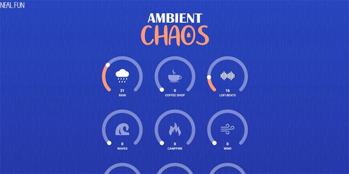 Nếu đang bận thực hiện một dự án quan trọng và cần một số tiếng ồn xung quanh thì mọi người có thể mở Ambient Chaos. Trò chơi này cung cấp nhiều âm thanh khác nhau mà người dùng có thể chơi và điều khiển, chẳng hạn như tiếng mưa, tiếng lửa trại, nhạc lofi,...