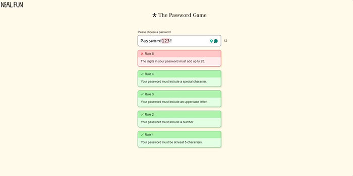 Trò chơi trở nên thú vị hơn bằng cách cung cấp nhiều yêu cầu mật khẩu khó hơn, chẳng hạn như đảm bảo rằng tất cả các số trong mật khẩu cộng lại bằng 25. Thật thú vị khi mọi người có thể tạo mật khẩu hoàn hảo cho tài khoản tiếp theo của mình bằng cách chơi trò chơi giải đố đầy thử thách này.