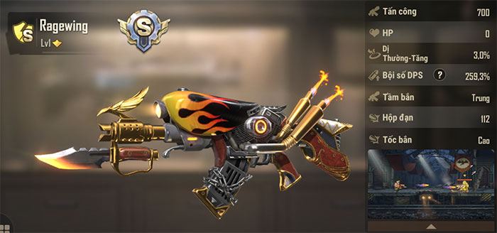 Gatling Gun nổi bật với sát thương đầu ra ổn định và fire rate lớn nhất trong Metal Slug: Awakening, phù hợp cho nhân vật nắm vai trò DPS chủ lực. Khẩu súng này nên được dùng cuối khi đồng đội đã gây đủ sát thương dị thường và tạo buff đủ để DPS chính có thể gây sát thương đầu ra cao nhất có thể trong khoảng thời gian buff.