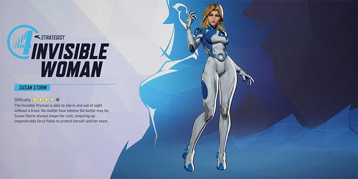 Invisible Woman có khả năng tàng hình và gây sát thương, nhanh chóng tung ra Psionic Vortex để liên tục gây sát thương cho kẻ thù theo thời gian, sử dụng Force Physics để đẩy bất kỳ ai đến quá gần cô ấy ra xa. Ngoài ra, Guardian Shield cho phép cô ấy giúp đỡ đồng minh từ xa, phủ nhận sự thiếu hụt về phạm vi trong bộ kỹ năng.