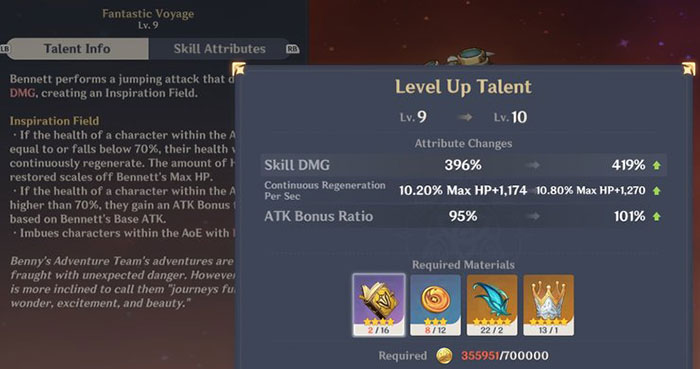 Cả tỷ lệ hồi máu và thiệt hại của Bennett đều dựa trên cấp độ của thiên phú, vì vậy dành 1 Crown of Sight cho nhân vật này là xứng đáng vì mọi người thậm chí còn nhận được bonus cao hơn.
