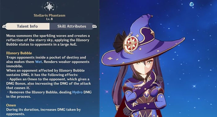 Ở cấp độ tài năng 7 trở lên, thời gian hỗ trợ sát thương lên tới 5 giây trước khi kết thúc. Tuy nhiên, nếu áp dụng Cryo trước khi sử dụng Mona, Stellaris Phantasm sẽ dừng đồng hồ bấm giờ, cho phép gia hạn buff. Điều đó làm cho Mona trở thành một trong những nhân vật tốt nhất để sử dụng trong Freeze.