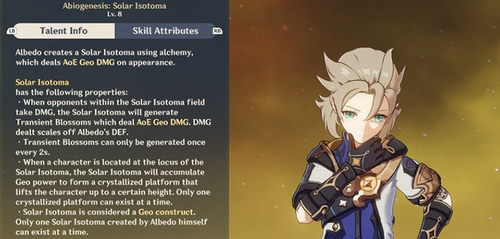 Nếu muốn một nguồn sát thương ngoài sàn đấu đáng tin cậy, Albedo là lựa chọn tuyệt vời. Kỹ năng nguyên tố của anh ta đặt một cột Geo điên cuồng trong 30 giây, gây sát thương đáng tin cậy trong một khoảng thời gian.