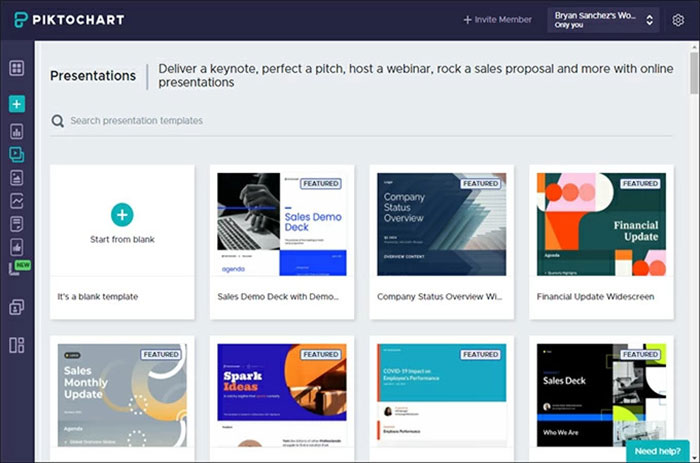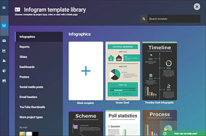 Thư viện của có có rất nhiều mẫu, hầu hết đều phù hợp với mọi loại tình huống, từ bản trình bày đến lập kế hoạch công việc. Trong số các công cụ, Piktochart gần giống với Canva nhất.