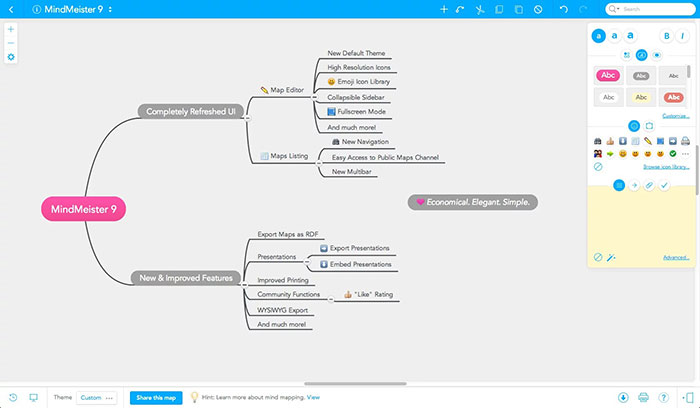 Với MindMeister, mọi người có thể tạo, chia sẻ và cộng tác chỉnh sửa mindmap, đồng thời thêm biểu tượng, hình ảnh, ghi chú, liên kết và tệp đính kèm. Ngoài ra nó còn tích hợp trò chuyện trực tiếp, quản lý tác vụ và thông báo cùng vô số tính năng tiện ích khác.