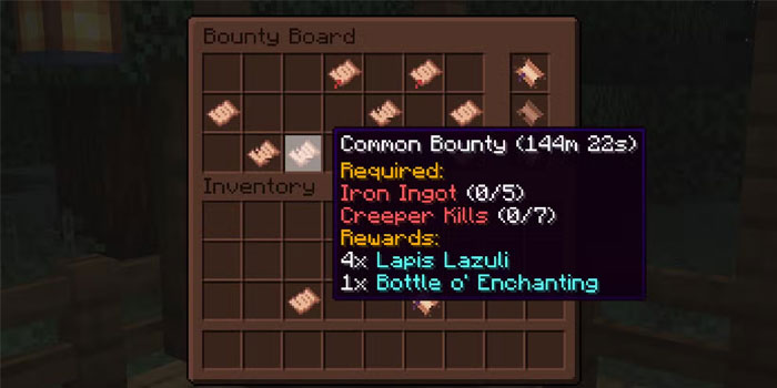 Bountiful là một bản mod Minecraft bổ sung bounty board vào trò chơi. Về cơ bản, đây là những nhiệm vụ mà có thể hoàn thành để nhận được phần thưởng. Giống như tiền thưởng trong RPG, một số nhiệm vụ khó hơn những nhiệm vụ khác. Nhiệm vụ khó hơn có thể mang lại phần thưởng hiếm hơn, khiến chúng trở nên đáng giá.