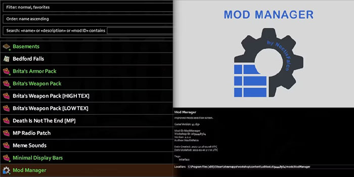 Mod Manager cung cấp các cách để sắp xếp, lọc và tìm kiếm, đồng thời cho phép xem liệu một bản mod đến từ tệp đã nhập hay đăng ký Steam Workshop. Nếu muốn thay đổi các quy tắc trong thế giới của mình thường xuyên, game thủ cũng có thể lưu trữ hồ sơ cho các cấu hình mod khác nhau mà không cần nhấp chuột liên tục.