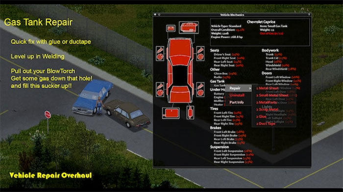 Bản mod này hoạt động ở cả chế độ chơi đơn và nhiều người chơi, đồng thời khá chi tiết, cho phép mọi người sửa chữa mui xe, ghế ngồi, cửa ra vào, bình xăng, kính chắn gió và cửa sổ, hộp đựng găng tay, thùng đựng hàng hóa,... Với bản mod này, game thủ có thể khôi phục bất kỳ phương tiện nào về thời kỳ huy hoàng trước ngày tận thế.