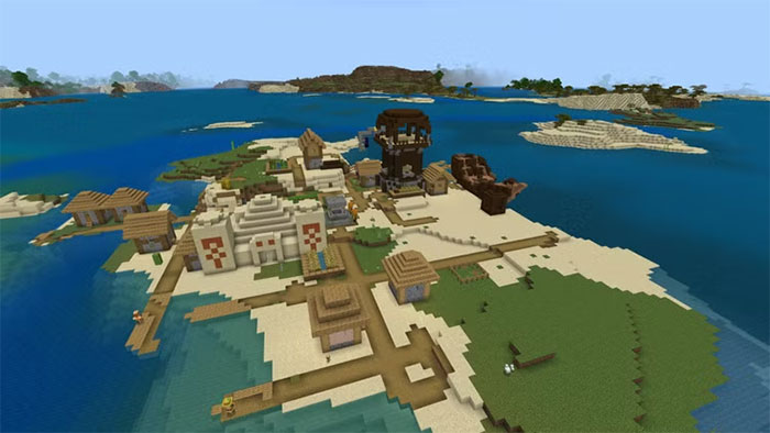 Với vị trí xuất hiện trên một hòn đảo nhỏ cạnh vùng địa hình cực kỳ ấn tượng của biome Windswept Savanna, seed này thực sự đặc biệt. Khu vực này được bao phủ bởi biome rừng rậm, cho phép xây dựng và chế tạo bằng bộ gỗ tre mới ngay từ đầu game. Ngọn núi khổng lồ phía sau không chỉ tạo nên phông nền hoàn hảo cho công trình mà còn là một vị trí tuyệt vời để xây dựng nhà ở trong Minecraft.