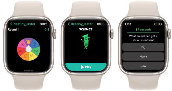 Trivia Crack đặt câu hỏi cho người dùng bao gồm rất nhiều thể loại, yêu cầu phải trả lời bằng cách sử dụng các câu trả lời trắc nghiệm. Trivia Crack cho Apple Watch chỉ cần đặt thao tác trên cổ tay, vì vậy nó có thể chơi mọi lúc mọi nơi, quay bánh xe, đọc câu hỏi và trả lời trực tiếp trên đồng hồ.
