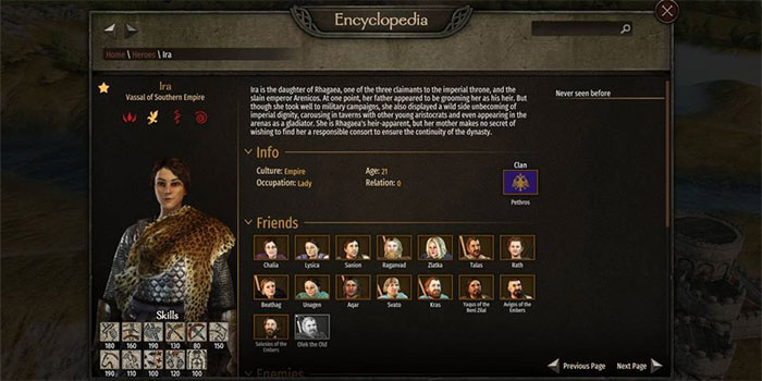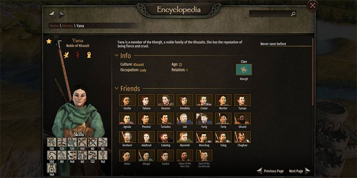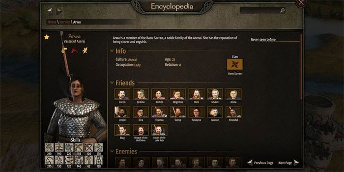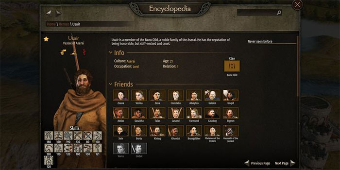 Cô ấy mới ngoài 20 tuổi nhưng đã có kỹ năng chiến đấu và xã hội rất cao, hứa hẹn sẽ là một đội trưởng đáng gờm cho đội quân quý tộc Aserai. Kỹ năng quản lý chỉ có 60 nên cô sẽ không phải là lãnh đạo đảng hay thống đốc giỏi nhất, nhưng thật dễ dàng để rèn luyện kỹ năng đó với một chút kiên nhẫn.