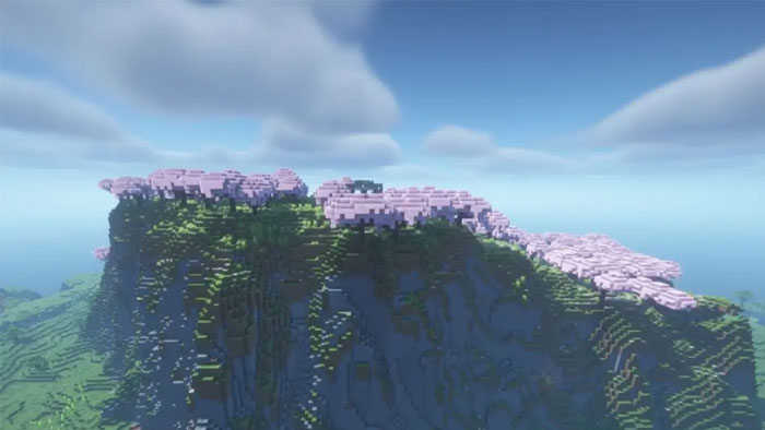 Điều làm nên sự tuyệt đẹp của hoa anh đào ngoài đời chính là khi chúng tô điểm cho cả một dãy núi, tạo nên những gam màu rực rỡ. Với seed này trong Minecraft, người chơi có thể trải nghiệm điều tương tự với một đỉnh núi nổi bật. Nó bắt đầu từ những cánh đồng cỏ xanh mướt và dần dần phủ tuyết, băng trên đỉnh.