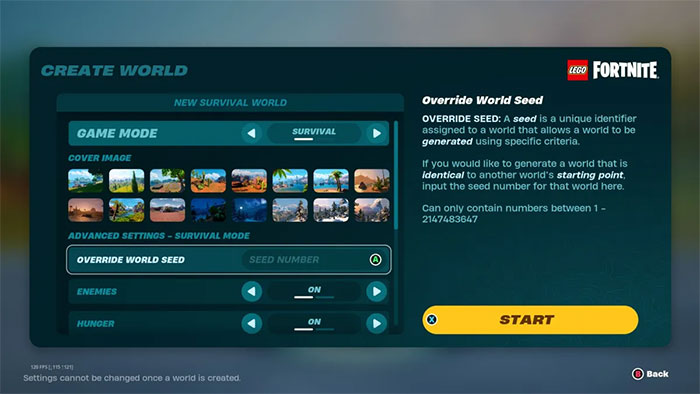Để sử dụng World Seed, game thủ cần tạo một thế giới mới từ menu chính. Trên màn hình Create World, trong phần Advanced Settings, mọi người sẽ thấy tùy chọn Override World Seed. Chọn mục này và nhập seed LEGO Fortnite muốn sử dụng.