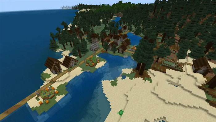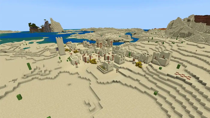 Những hòn đảo Minecraft tuyệt nhất là những hòn đảo có làng mạc. Ngôi làng sa mạc này rất lớn, cho phép người chơi tiếp cận ngay lập tức với thức ăn và lạc đà trong một môi trường không cung cấp nhiều thứ khác. Đi về phía đông của hòn đảo để tìm một bộ Warm Ocean Ruins nhô lên trên bề mặt đại dương. Mọi người cũng sẽ tìm thấy một hòn đảo khác có làng sa mạc nếu đi về phía đông nam từ những di tích này. Ngược lại, đi về phía tây sẽ đưa người chơi đến một Tiền đồn Pillager và một sa mạc có quần xã sinh vật Badlands cùng với khu rừng.