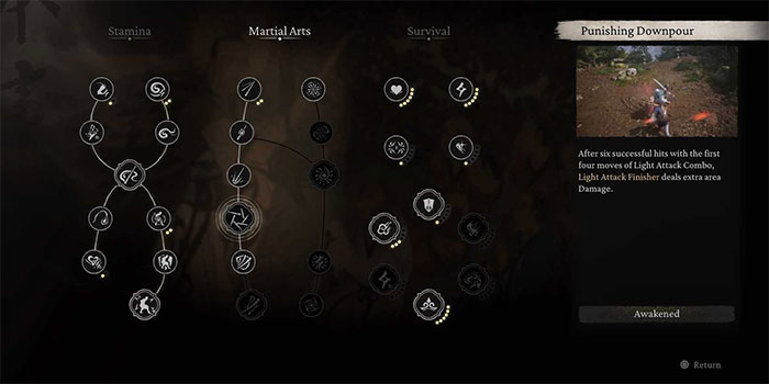 Punishing Downpour là một kỹ năng liên quan đến việc tấn công kẻ thù, có thể tìm thấy trong danh mục Martial Arts của cây kỹ năng Foundation. Punishing Downpour tăng sát thương gây ra cho kẻ thù bằng đòn kết liễu tấn công nhẹ sau 6 đòn đánh liên tiếp.