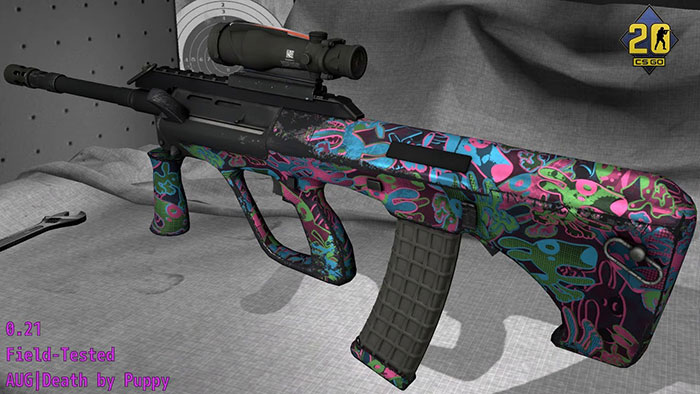 Ở cấp độ chuyên nghiệp, không phải người chơi nào cũng chọn AUG cho phe phòng thủ. Đồng thời, các nhà thiết kế tích cực tạo giao diện mới cho vũ khí này. Death by Puppy được coi là một trong những lựa chọn hấp dẫn nhất với hình ảnh những chú chó con nhiều màu sắc trên súng.