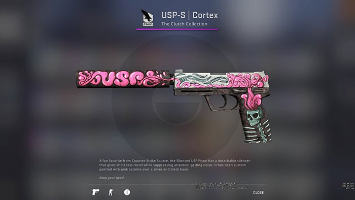 Trên tay cầm của khẩu súng, người chơi có thể thấy hộp sọ quay sang trái. Đồng thời, trên khắp bề mặt của khẩu súng lục là các phần tử màu hồng trông giống như kẹo cao su. Nói chung, mọi người có thể sở hữu một vũ khí bắt mắt tại vòng đấu súng lục bằng cách cách sử dụng USP-S Cortex.