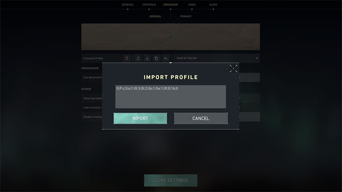 Cách dùng code tâm ngắm crosshair trong Valorant Mở Valorant và đi tới Settings Chọn tab Crosshair ở đầu trang Settings . Nhấn nút Import (nút thứ ba ở bên phải của Crosshair Profile và có mũi tên chỉ xuống). Sao chép code crosshair Valorant ở trên vào ô trống và nhấn nút Import .